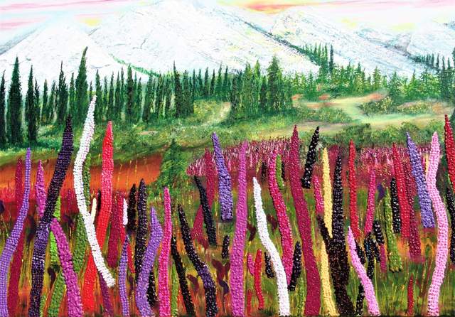 A very colourfull landscapes filled with lupines, trees and mountains. Summertime in the mountains and all over colours. Painted with acrylic on linen and the linen stretched in aluminium, keeps tight. Ready to hang on your wall. Of course if you want and live in the Netherlands you can make an appointment to see the painting in person. If you want to see more photo`s please send an email.