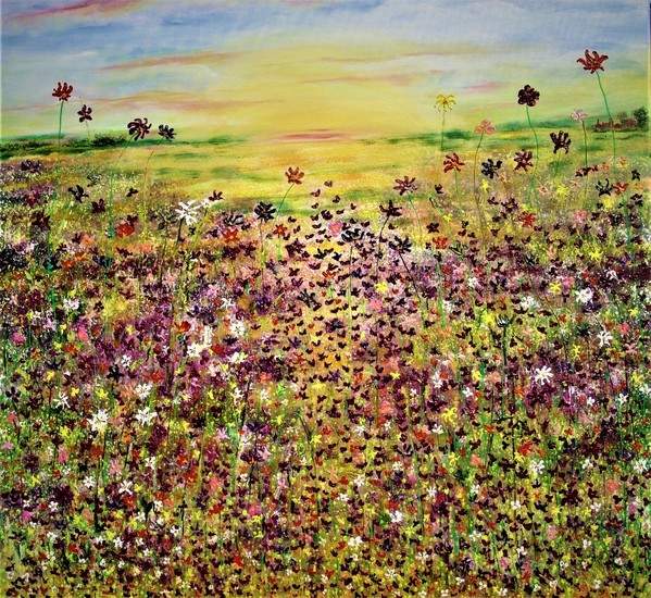 Large coloured painting in size 100 x 100 cm. a landscape full of cheerful flowers in the sunshine. Summer for me with cheerful warm colors. Painted with acrylic on 100% linen and slightly finished with varnish to maintain the bright colors. Including hanging work. For the buyer of this artwork artist has as a present a beautiful cushion with a print of the painting.