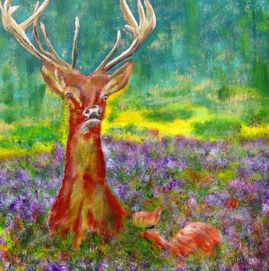 Curious deer with young, painted with acrylic on linen, sides painted through, needs no frame. Finished with varnish to preserve bright colours. Free delivery within the Netherlands or collection is of course also possible.