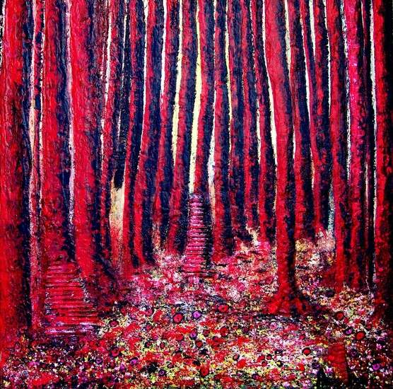 Red trees pasty painted in mixed technique. Flowers in the foreground of the forest whose trees almost come off the canvas. Wander along in this fairy-tale forest. Sides painted dark, can be hung without a frame, including hanging system.