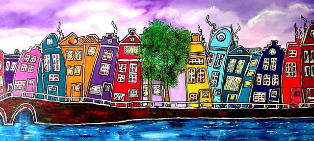 Amsterdamse grachtenhuizen, origineel geschilderd met acryl op linnen. Daarna geprint op aluminium en incl. ophangwerk. Maat 70 x 30 cm. Laatste exemplaar, sterk verlaagde prijs , profiteer van mijn opruiming in het atelier. Ophalen in Almere of verzending aangetekend.