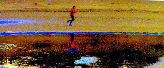Het spiegelbeeld van de hardloper op het strand is dat van een drenkeling die om hulp roept.