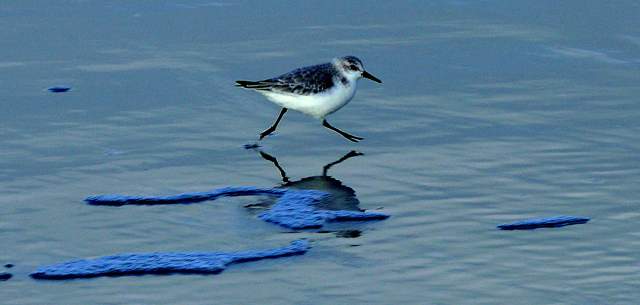 Als een bezetene rent de strandloper langs de kustlijn. `s Avonds moet hij bekaf zijn.