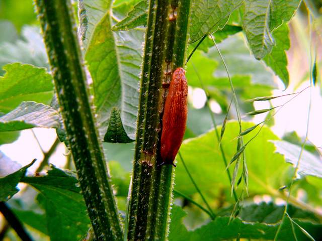 In dit macrolandschap lijkt de rode naaktslak een dominerende persoonlijkheid.