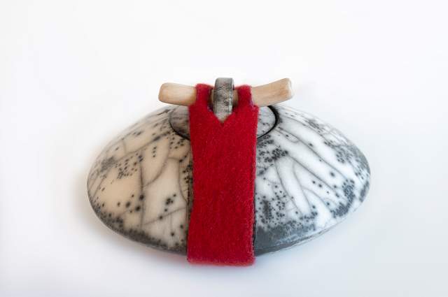 Materiaal: Keramiek rakugestookt, wol gevilt, hout