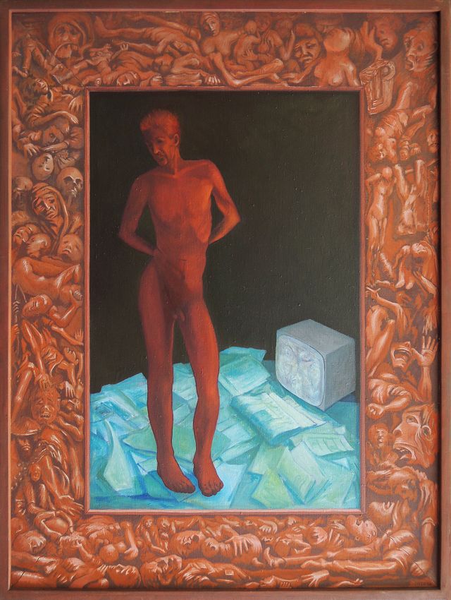 Martyr toont de heilige Sebastiaan als martelaar èn is een zelfportret. De figuur op het middenpaneel wordt getroffen door de berichten die hem bereiken via kranten en TV. Hij wendt zijn hoofd af. Hier zijn geen pijlen zichtbaar en men kan zich dus afvragen waarvan deze martelaar het slachtoffer is; lichamelijke wonden zijn onvindbaar. Het paneeltje wordt omgeven door een omlijsting waarin figuren los lijken te komen van het vlak, mensen die martelingen ondergaan, die het uitschreeuwen van angst en pijn, die gedood zijn. Van Egeraat heeft opzettelijk gekozen voor beelden uit de historie: het heden is even primitief als het verleden. Maar of je nou achter een boerenkar wordt weggesleept of achter een tank het is beide even gruwelijk. Deze aanklacht vormt niet een schilderij, maar een kader, het kader waarin ons leven zich letterlijk en figuurlijk afspeelt.